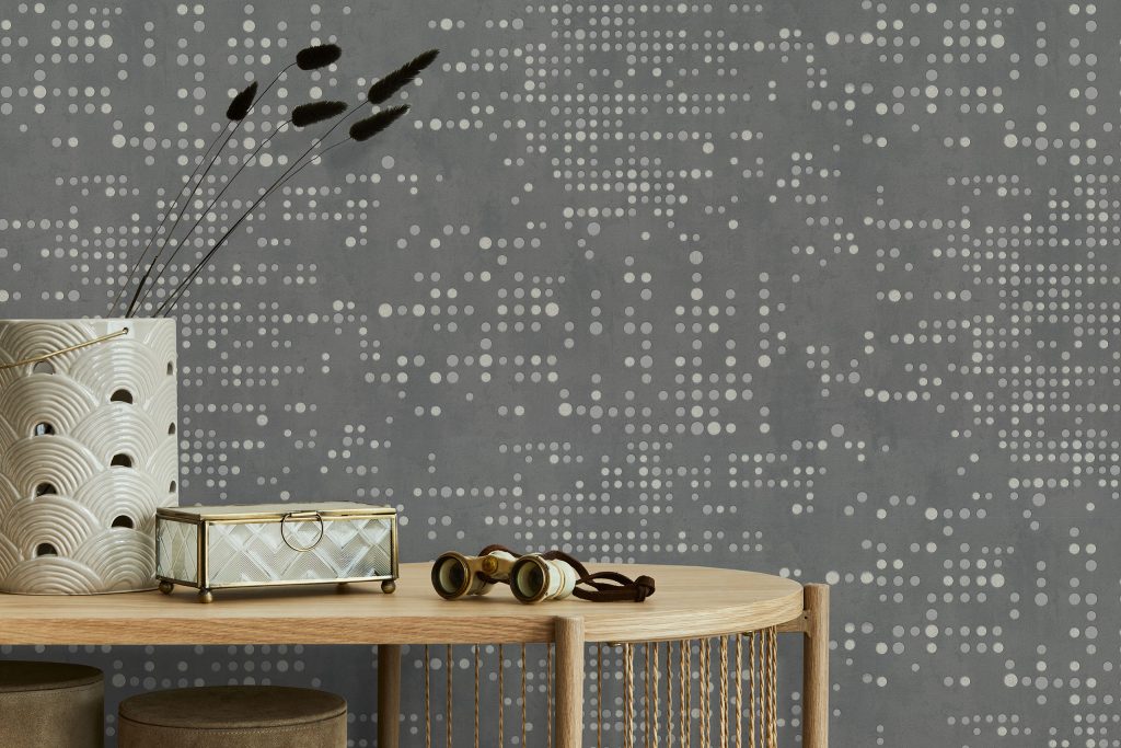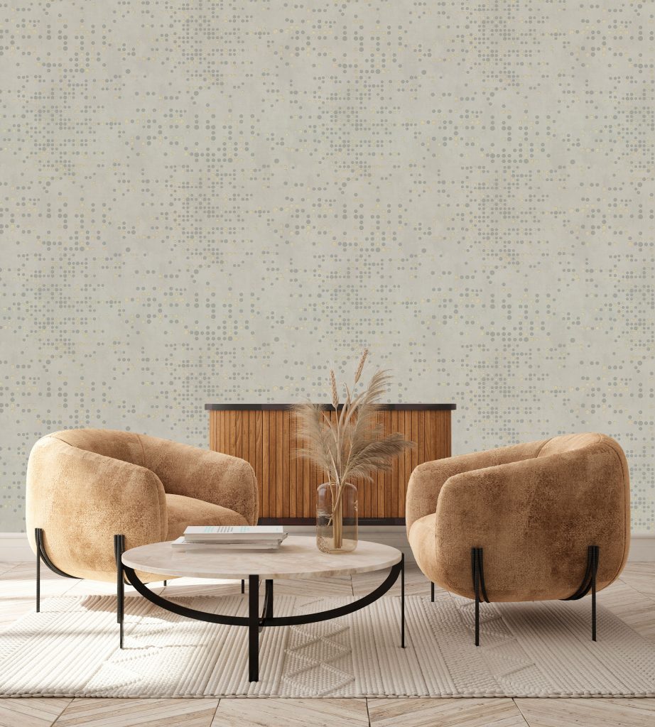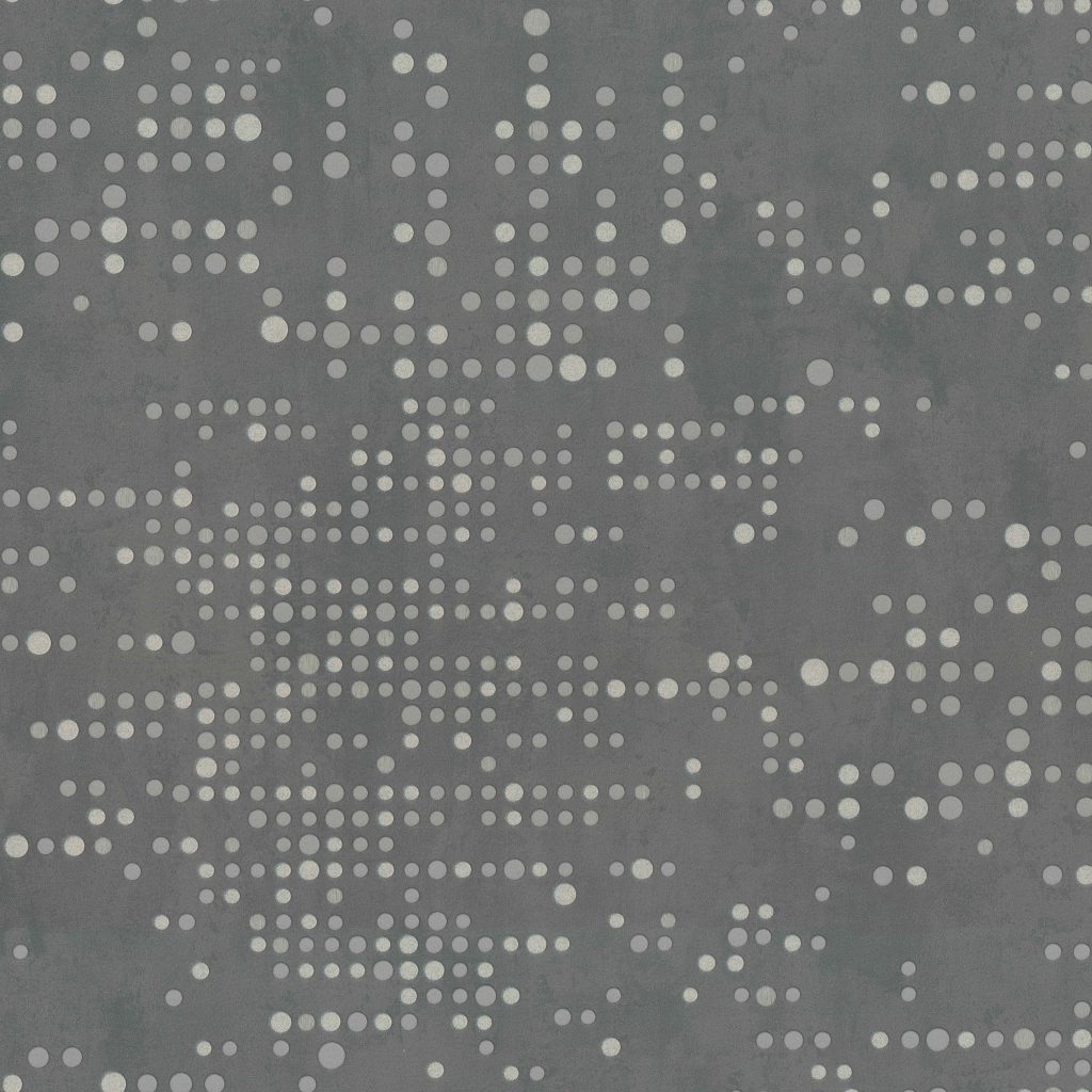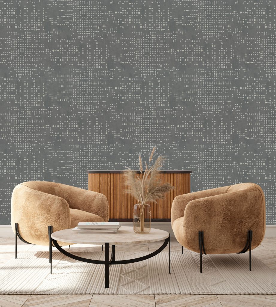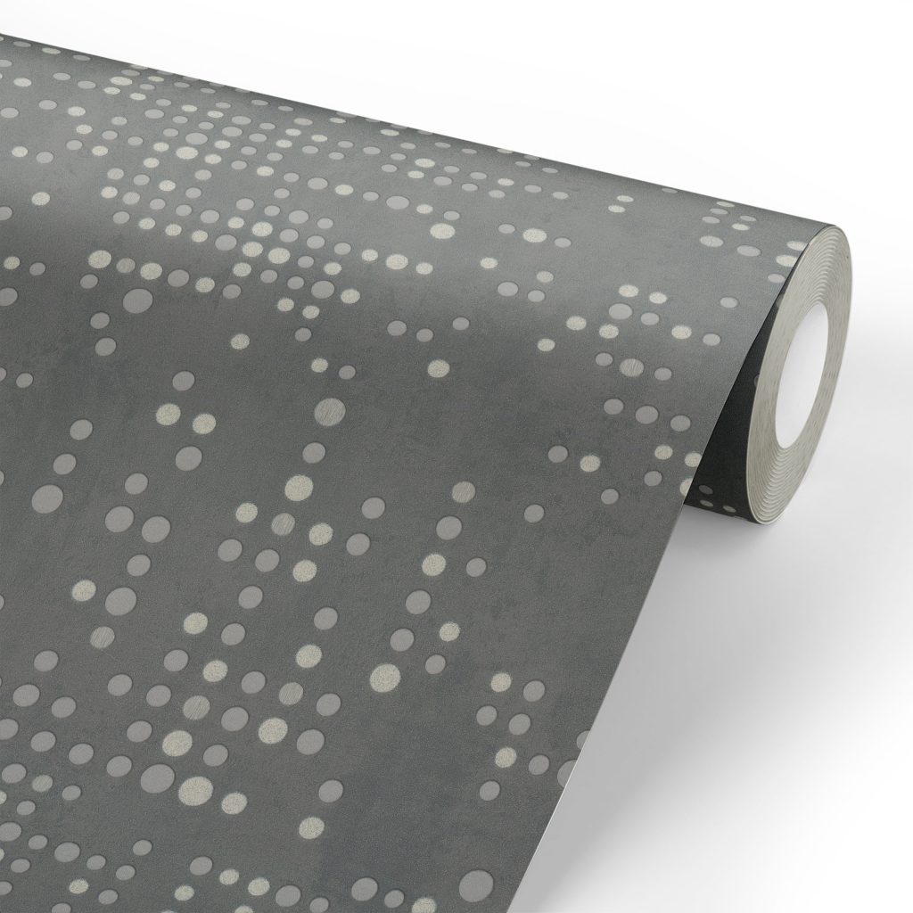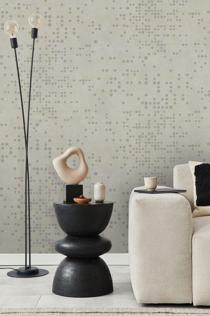 Фактура полотен имитирует декоративный бетон с легкой шершавостью и естественными потертостями, придавая коллекции урбанистический, индустриальный характер. Орнамент, состоящий из точек, дополнен акцентными вкраплениями глиттера, которые оживляют матовую поверхность и придают стенам объем, создавая эффект трехмерности. Декоративные элементы ведут себя по-разному в зависимости от освещения: при дневном свете они выглядят матовыми, а вечером начинают мерцать и переливаться, делая интерьер более праздничным.