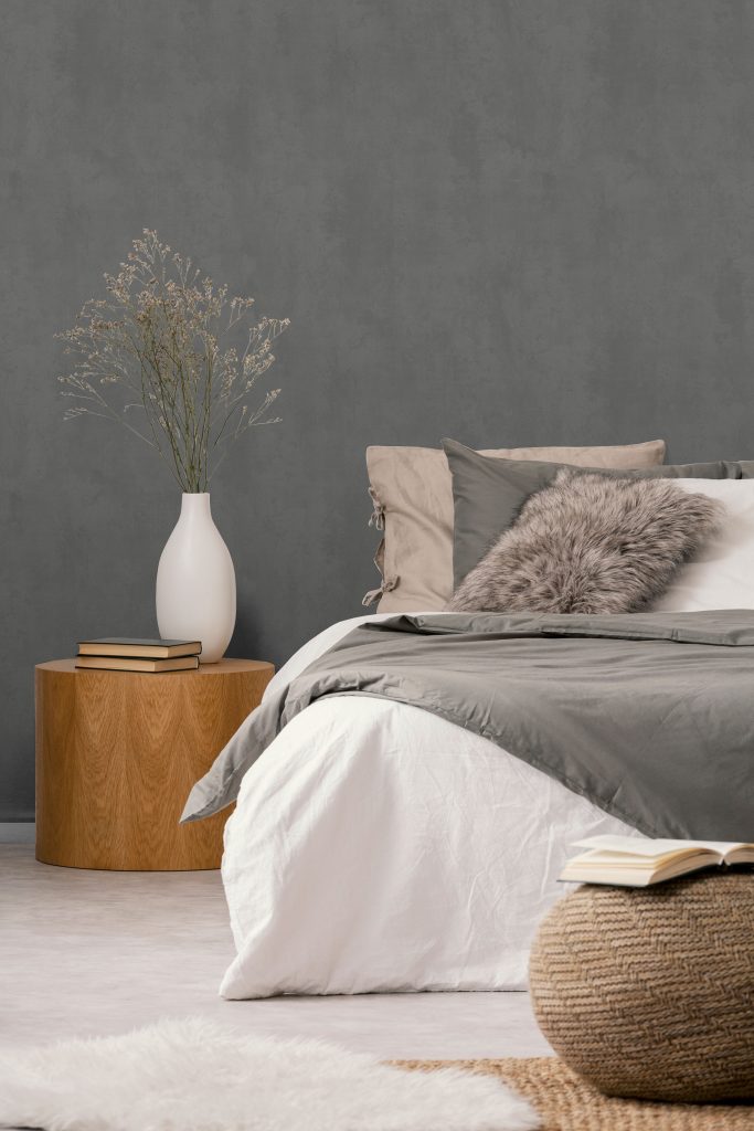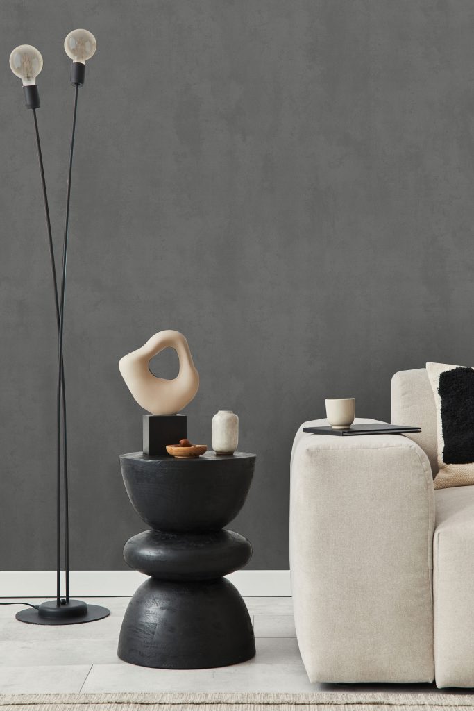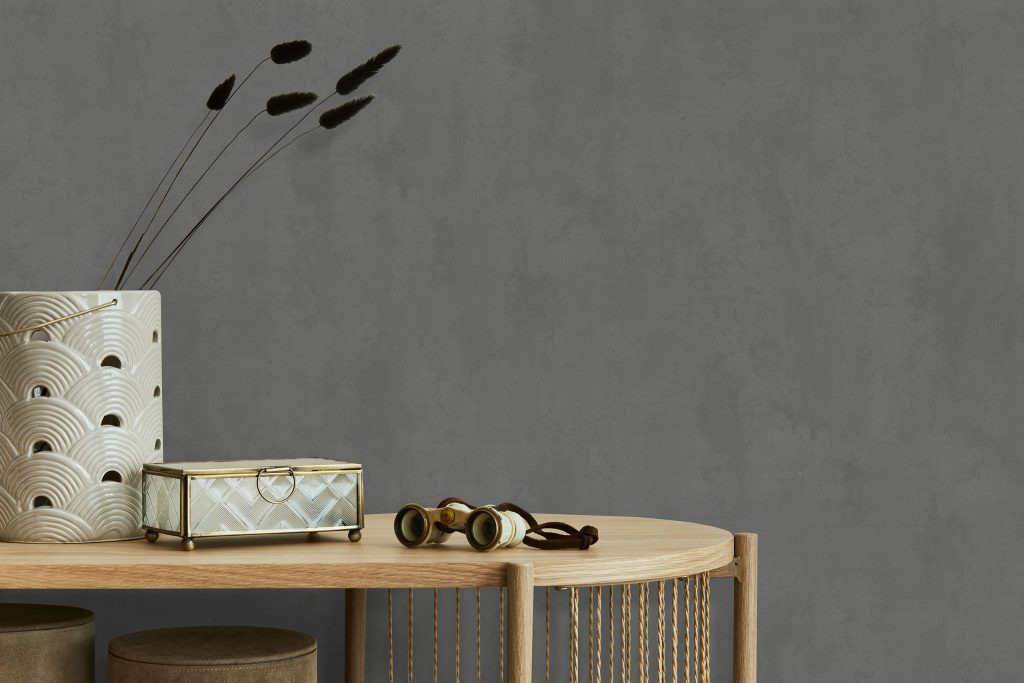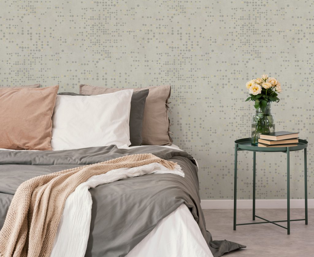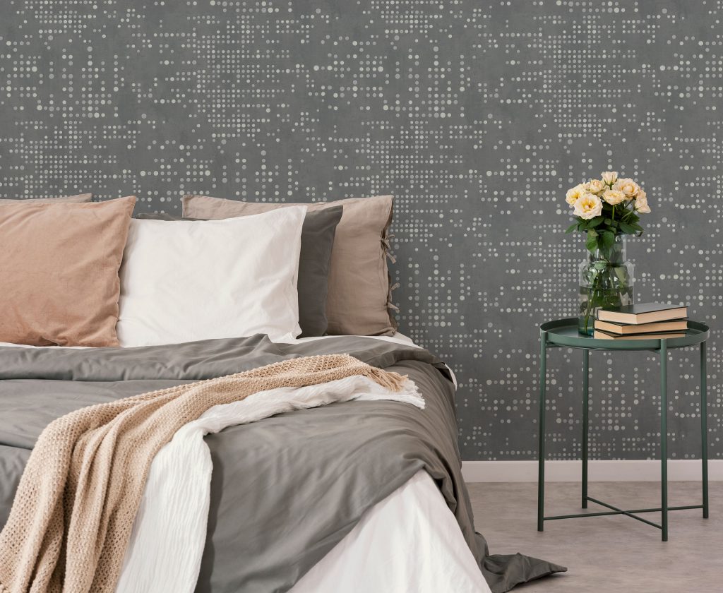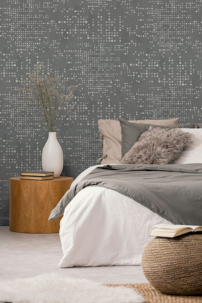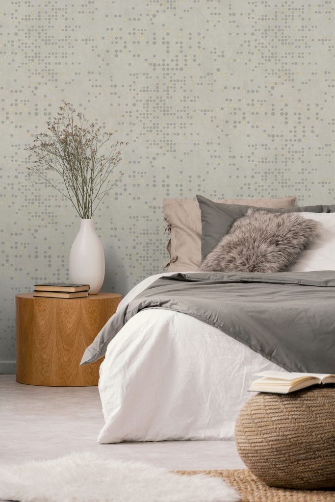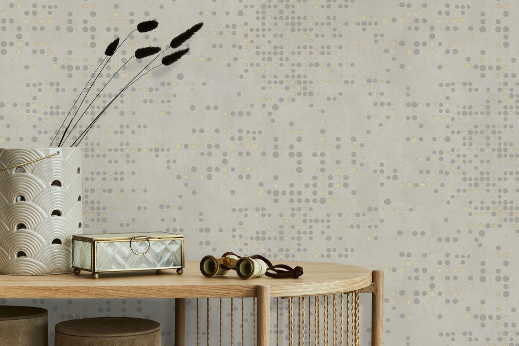 Фактура полотен имитирует декоративный бетон с легкой шершавостью и естественными потертостями, придавая коллекции урбанистический, индустриальный характер. Орнамент, состоящий из точек, дополнен акцентными вкраплениями глиттера, которые оживляют матовую поверхность и придают стенам объем, создавая эффект трехмерности. Декоративные элементы ведут себя по-разному в зависимости от освещения: при дневном свете они выглядят матовыми, а вечером начинают мерцать и переливаться, делая интерьер более праздничным.