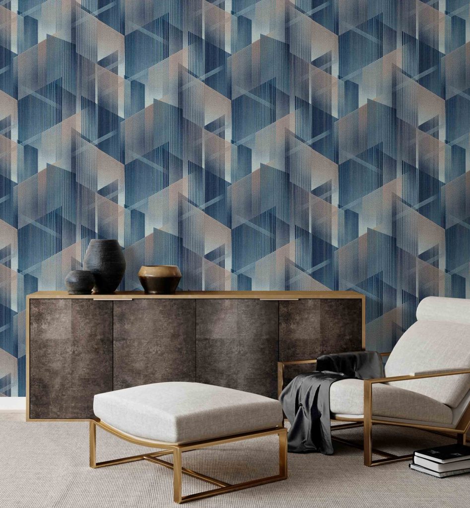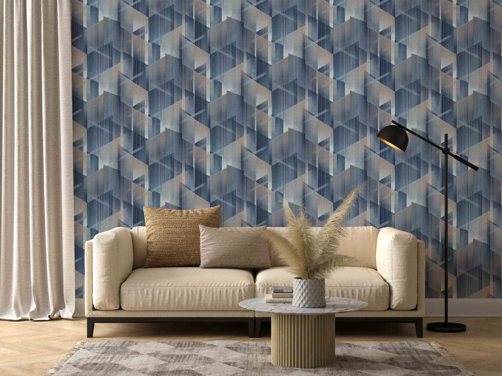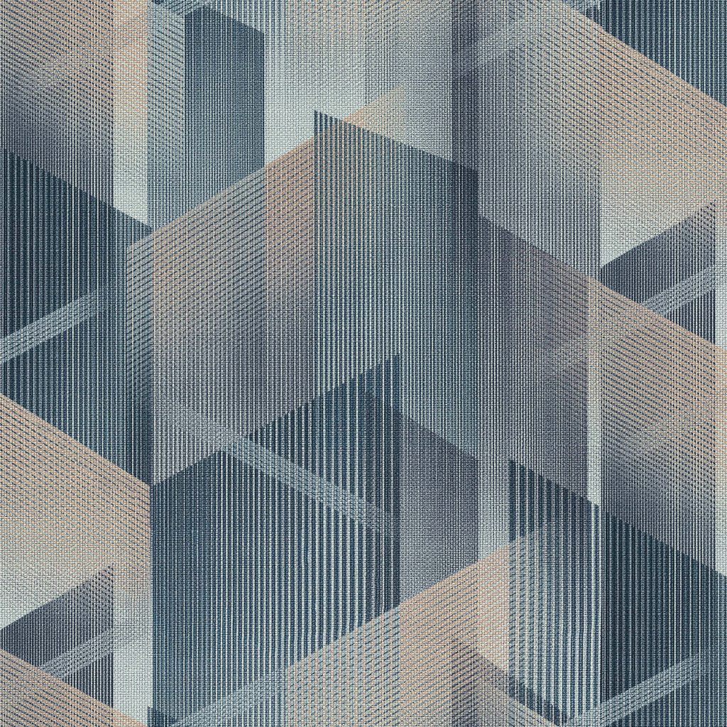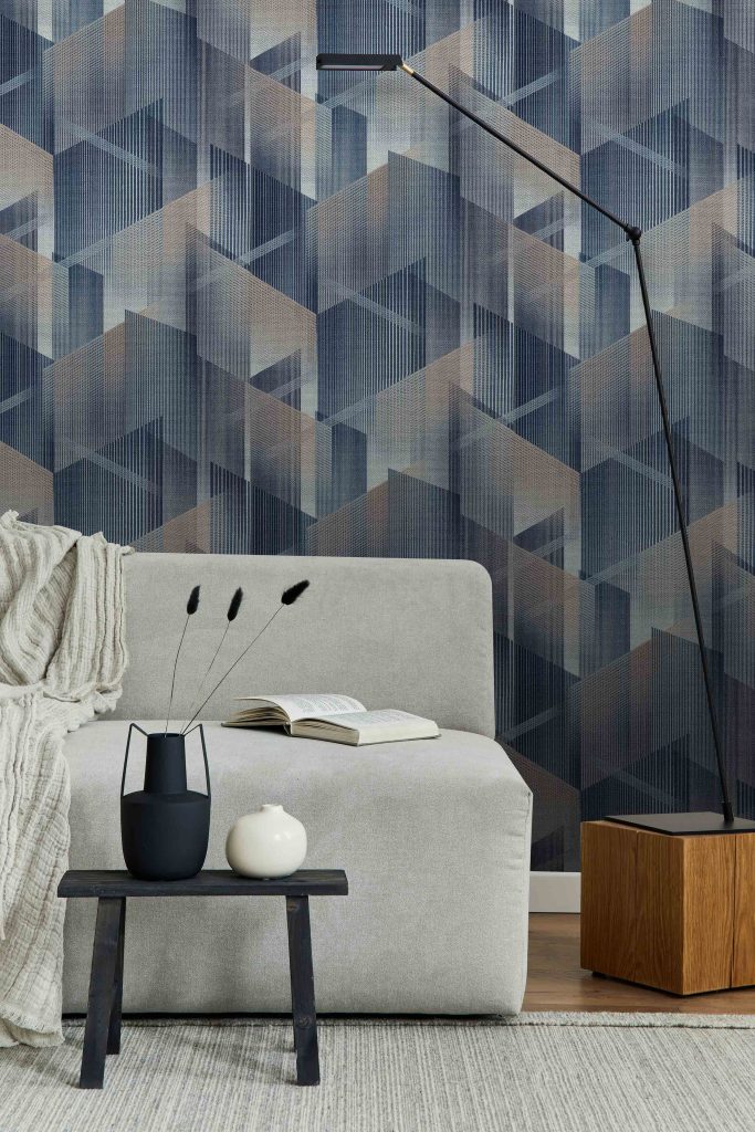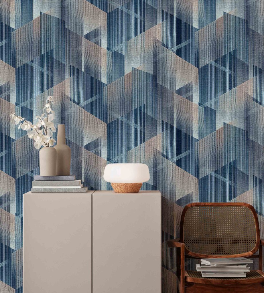 Многоуровневая структура рисунка создаёт оптическую иллюзию, придавая обоям трёхмерный эффект. Благодаря пересечению светлых и тёмных плоскостей создаётся ощущение движения — обои словно оживают при смене освещения или угла зрения, отражая переход от света к тени во время солнечного затмения. Мягкая фактура рогожки, напоминающая тонко сотканную ткань, придает поверхности тактильную глубину и смягчает строгость геометрического узора. Благодаря этому четкие линии выглядят уютно и гармонично, а свет, скользя по микрорельефу, подчеркивает сложную структуру рисунка.