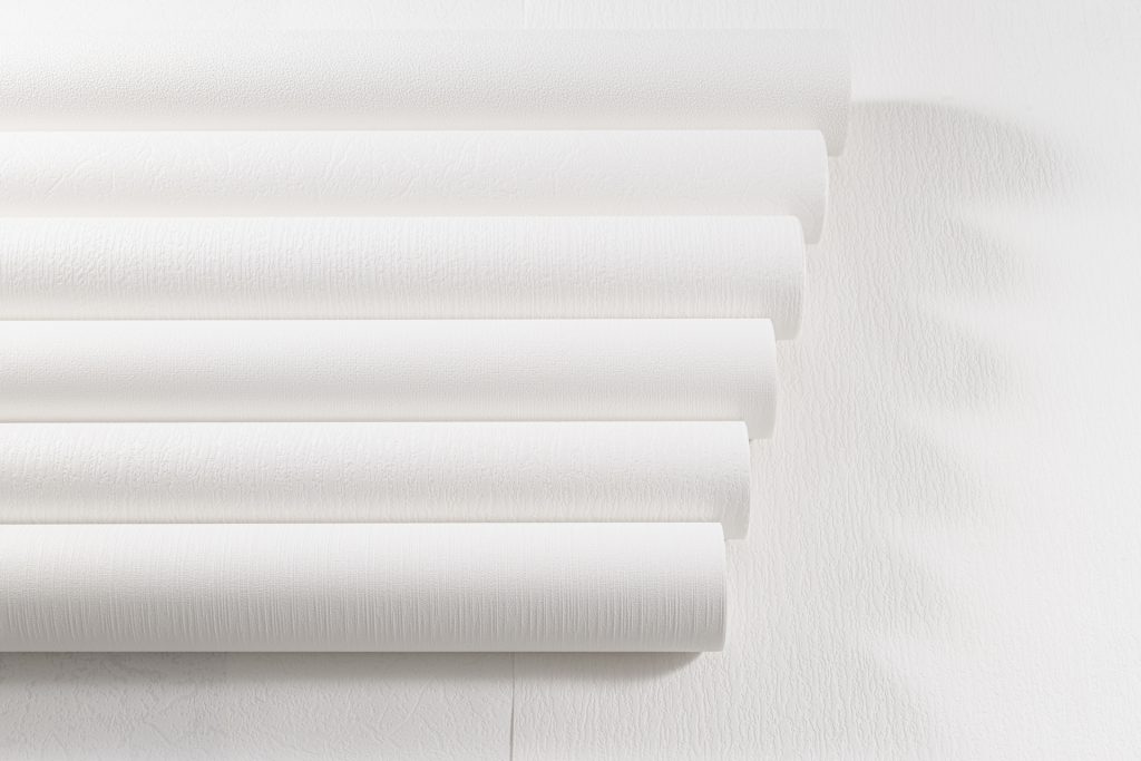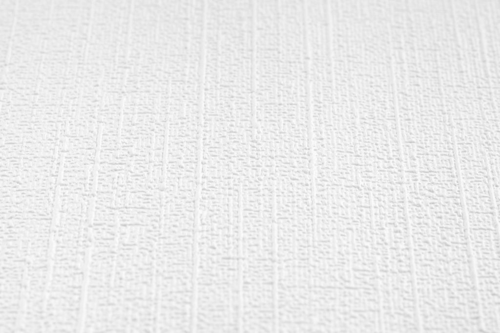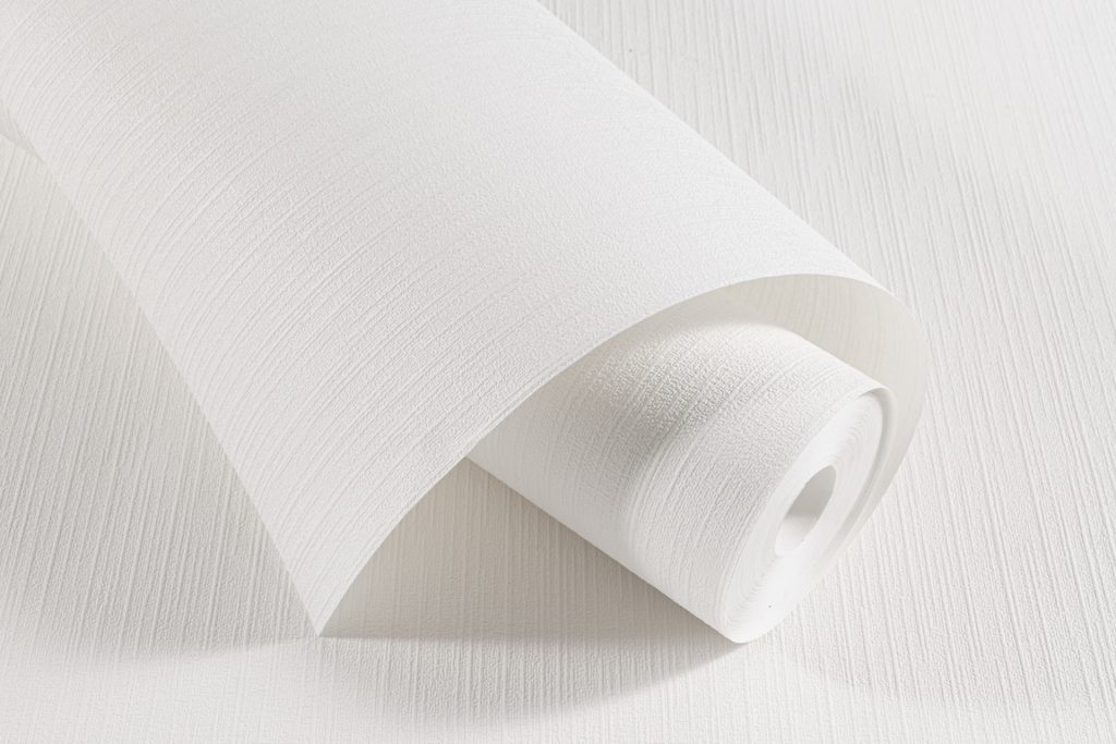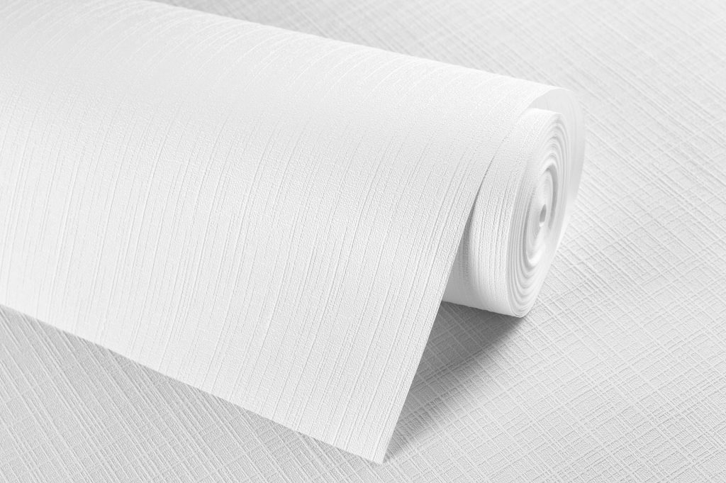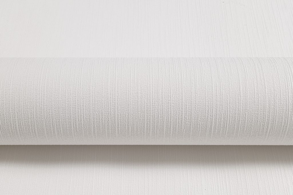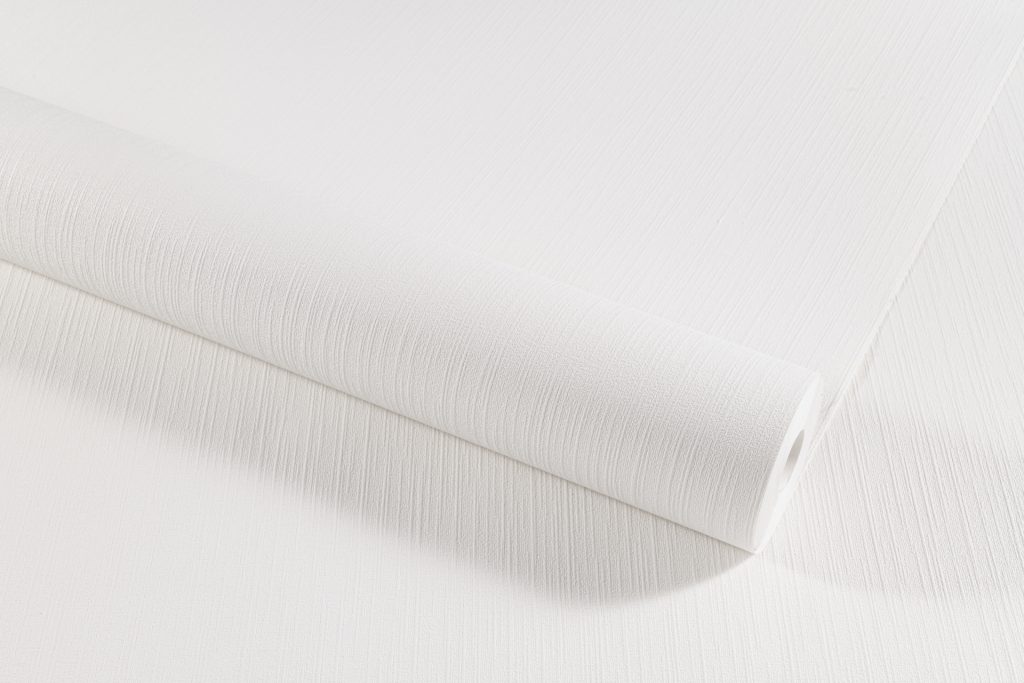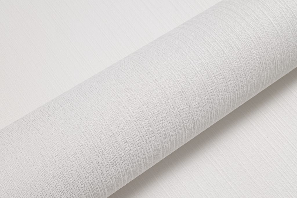 Белые, с рельефным вертикальным рисунком, имитирующим тонкие натянутые нити по всей высоте стены. Полотно широкое — 1,06×25 м, плотность около 250 г/м², основа флизелиновая, верхний слой виниловый, что делает обои прочными, антивандальными, устойчивыми к влаге и выгоранию, их можно многократно перекрашивать дисперсионными (водоэмульсионными) красками.